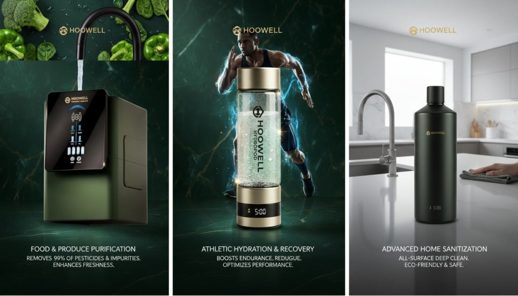 Two technologies. One architecture. The Hoowell Ioniser transforms your tap water across 5 pH modes — from pesticide removal to skin toning. The Hydropod delivers 1,200–3,000 ppb dissolved H₂ anywhere on earth. Distributed exclusively through AkgunTradeHub’s verified supply system.