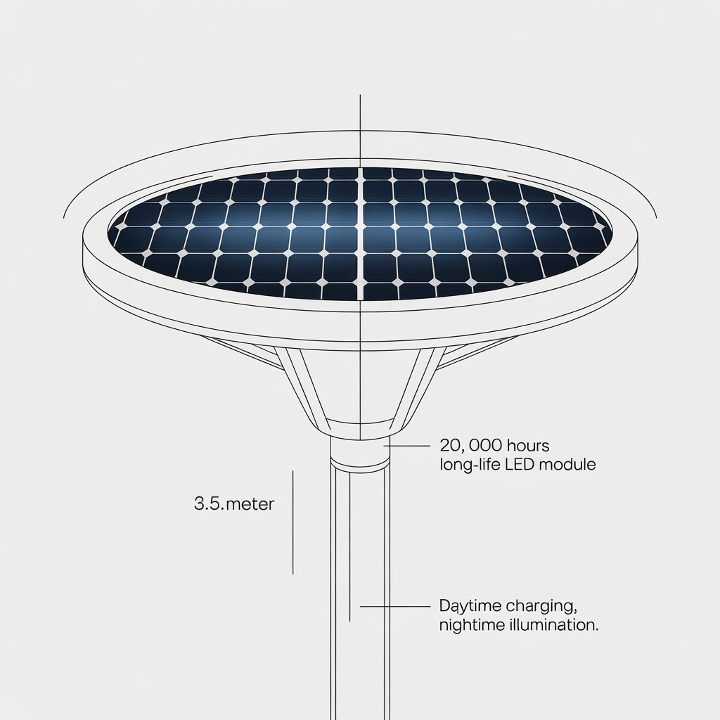 This street lamp, which charges throughout the day in sunlight, has a simple design but a useful function. Thanks to its sustainable energy sources and long lifespan, it doesn’t require any infrastructure. A technical drawing is shown in the image.