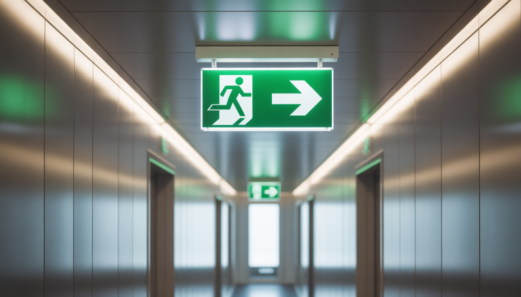 - Exit signs with clear pictograms and high visibility for corridors and doors.